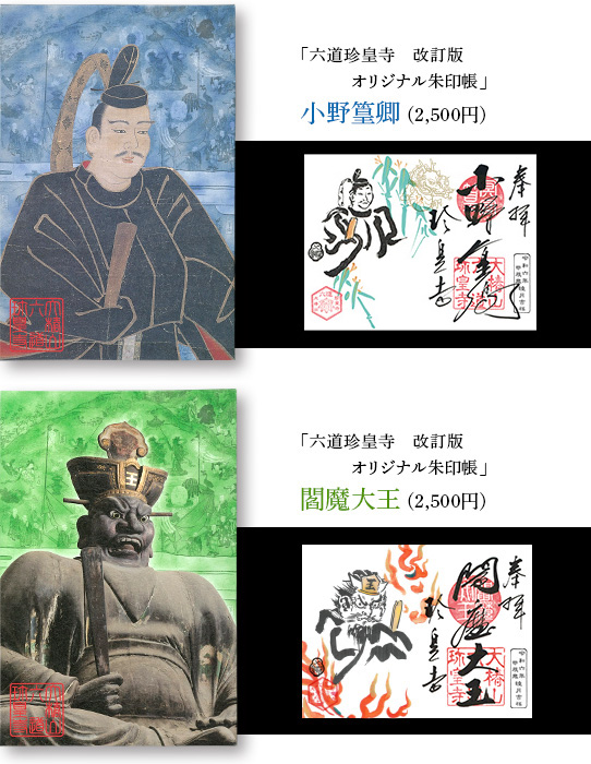 「だるま商店」絵師による「閻魔大王」と「小野 篁卿」各姿絵等を最初のページに特別に描いた2種の『六道珍皇寺 改訂版 オリジナル朱印帳』も限定数にてご授与させていただいております。